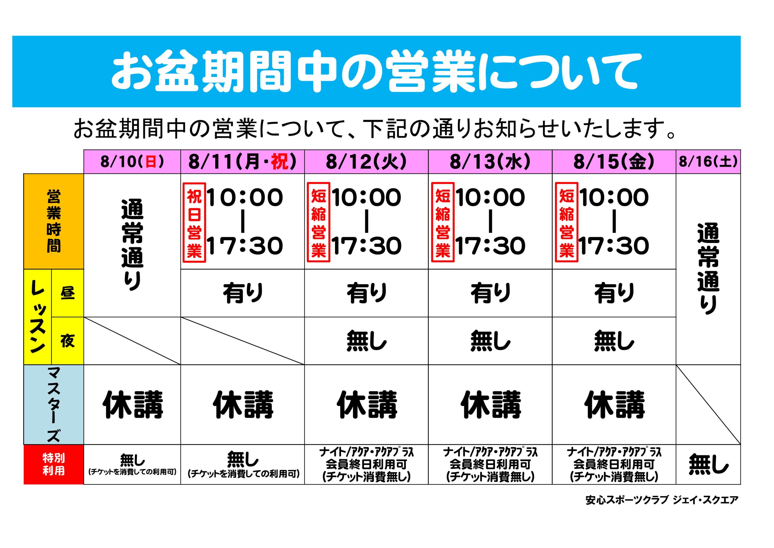 【ご案内】お盆期間中の施設営業について