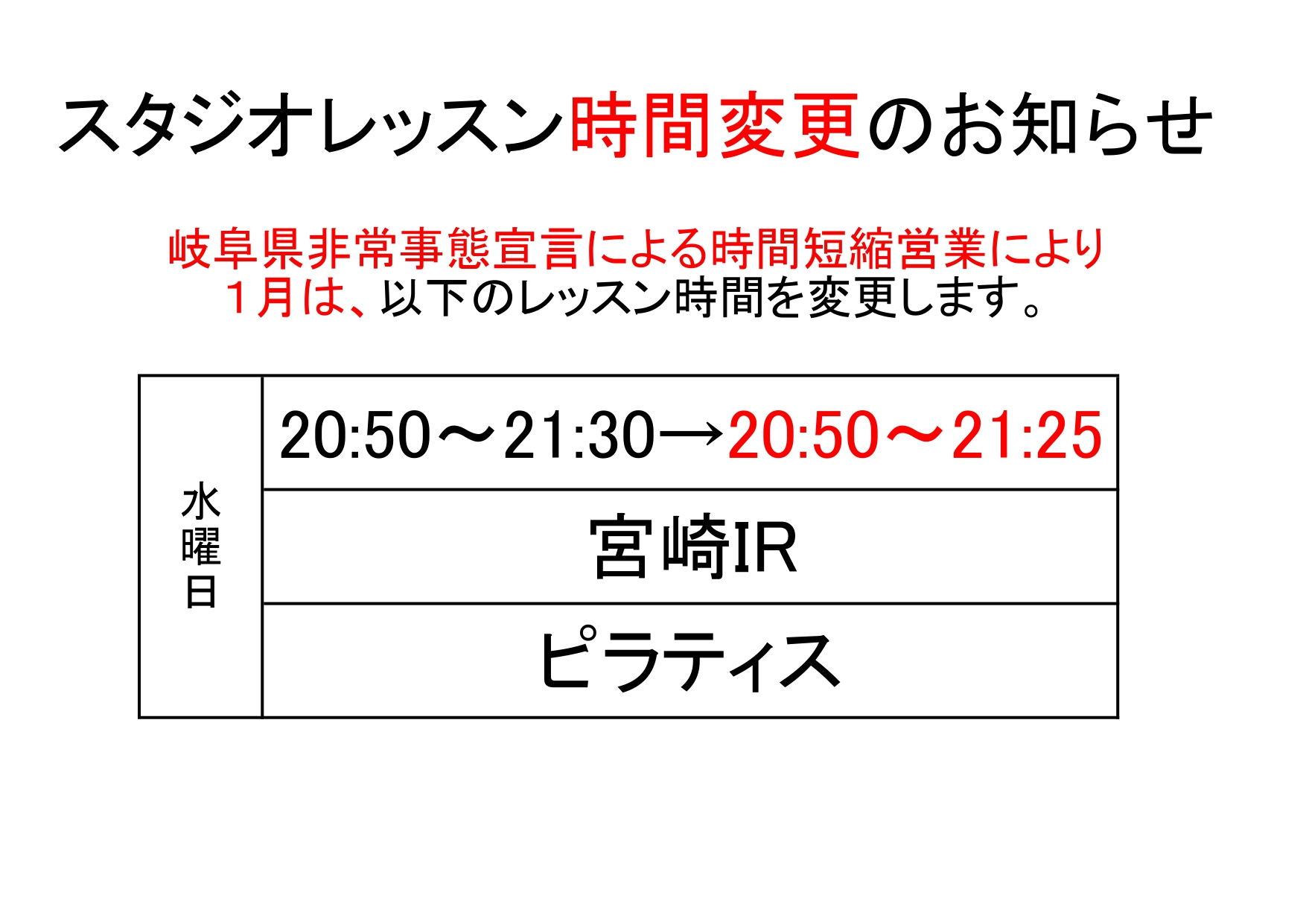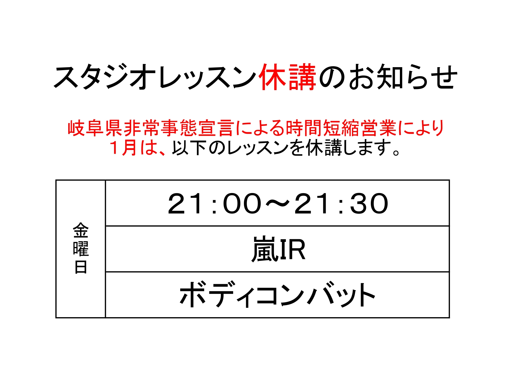 下記のスタジオレッスンを時間短縮、及び休講とさせていただきます。