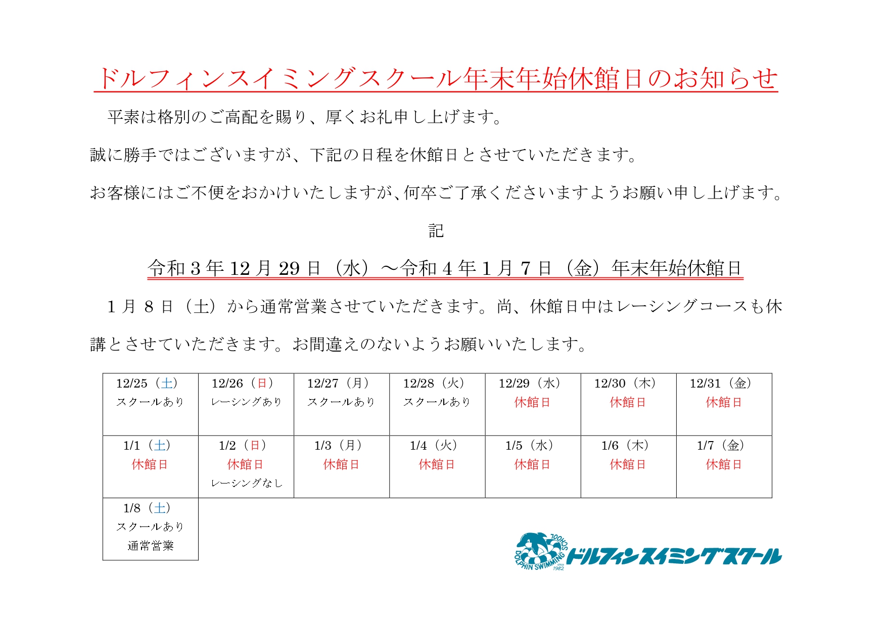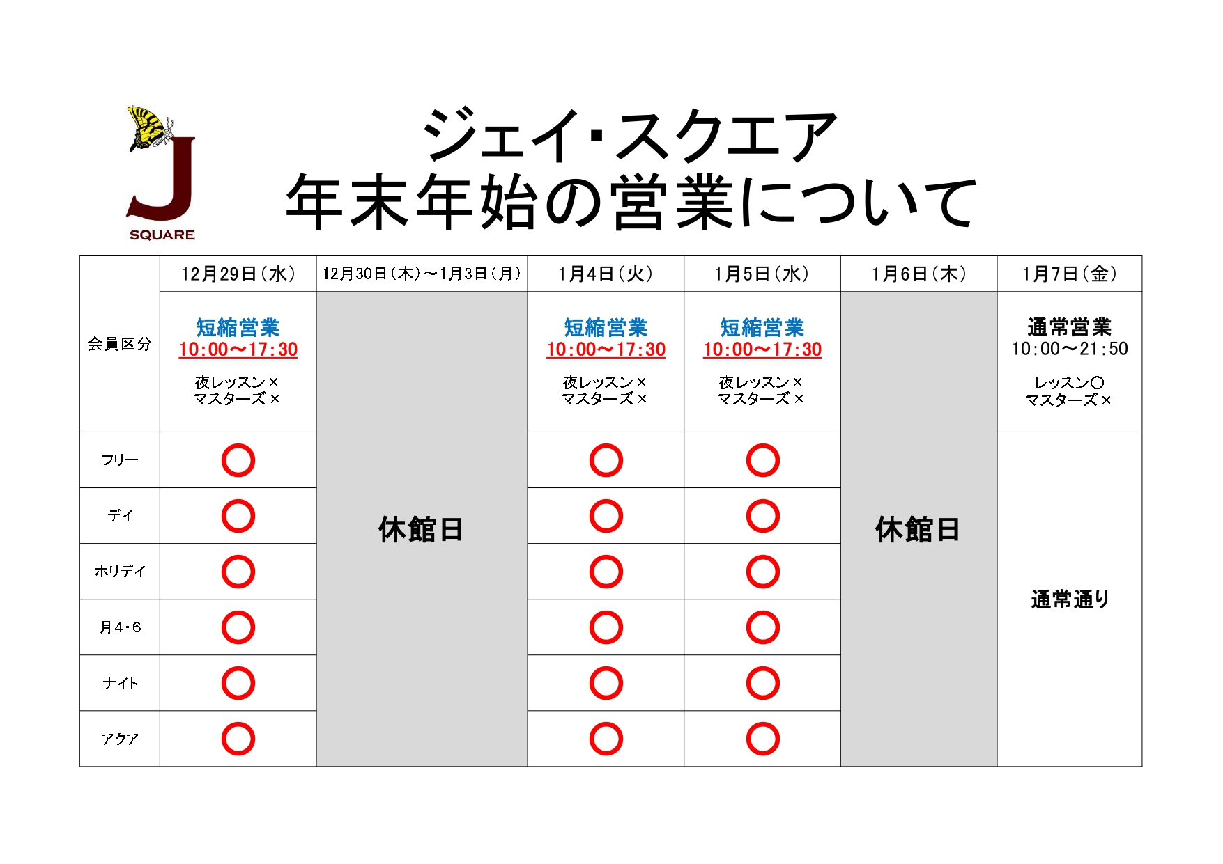 今月のカレンダー レッスンスケジュール