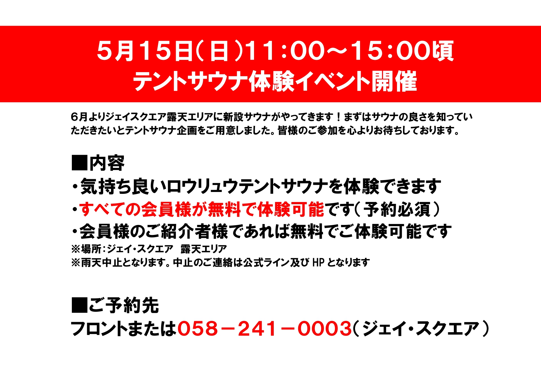 【お知らせ】テントサウナ 5月15日(日)実施します