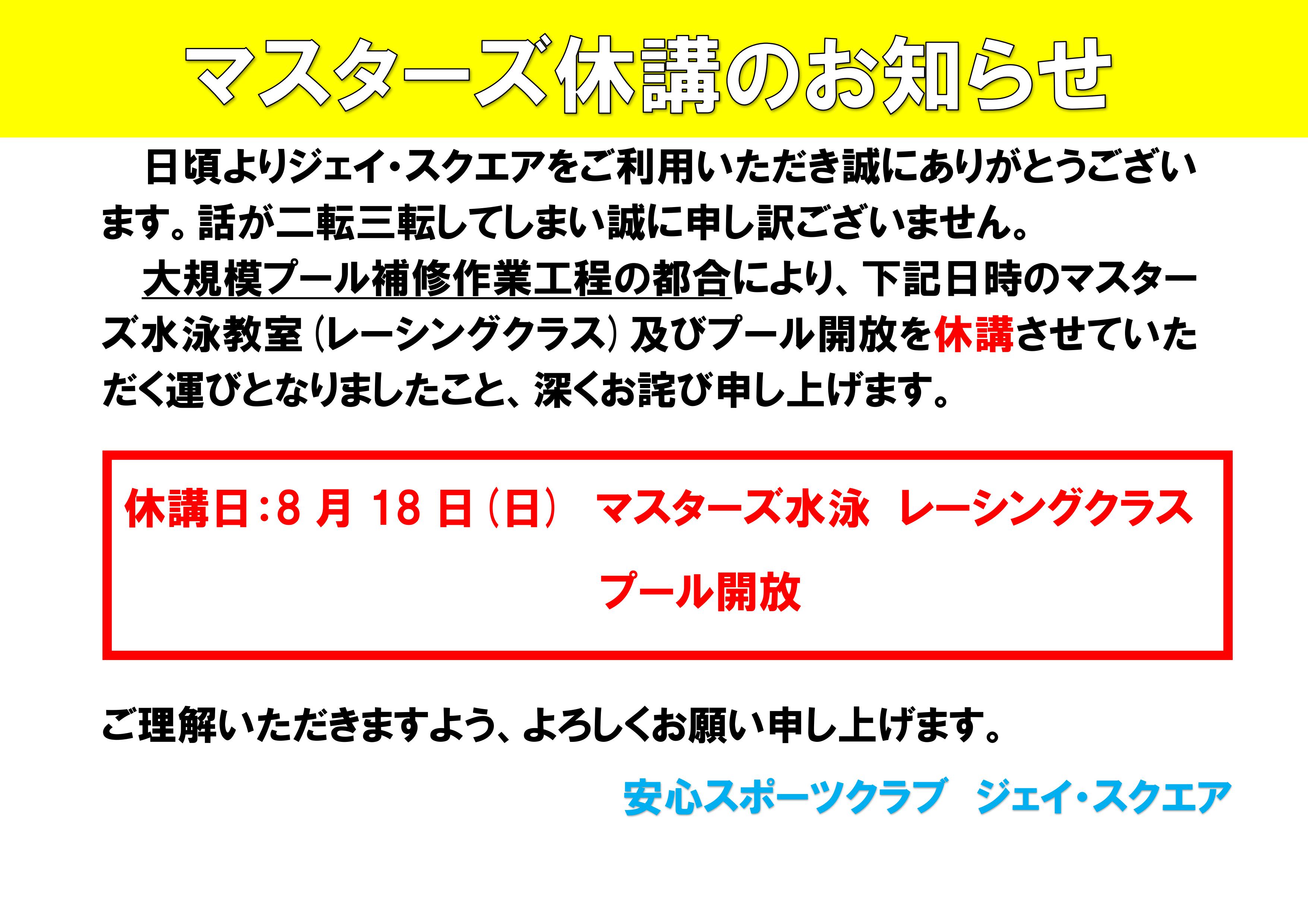 2024年08月09日 TOP お盆期間中の営業について 2024年のお盆期間中の営業についてご案内いたします。 尚、期間中及び8月18日(日)は隣接しているドルフィンスイミングスクールの25mプール補修工事のため、マスターズレッスンが休講となります。 予めご了承ください。