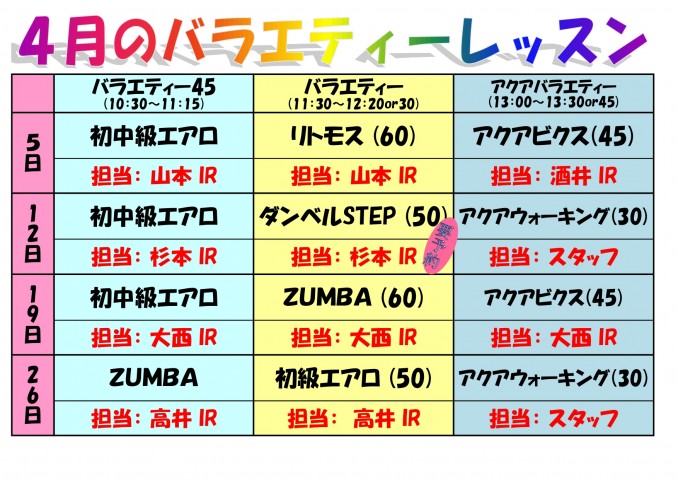 4月度のバラエティレッスンが決定しましたので、お知らせいたします。